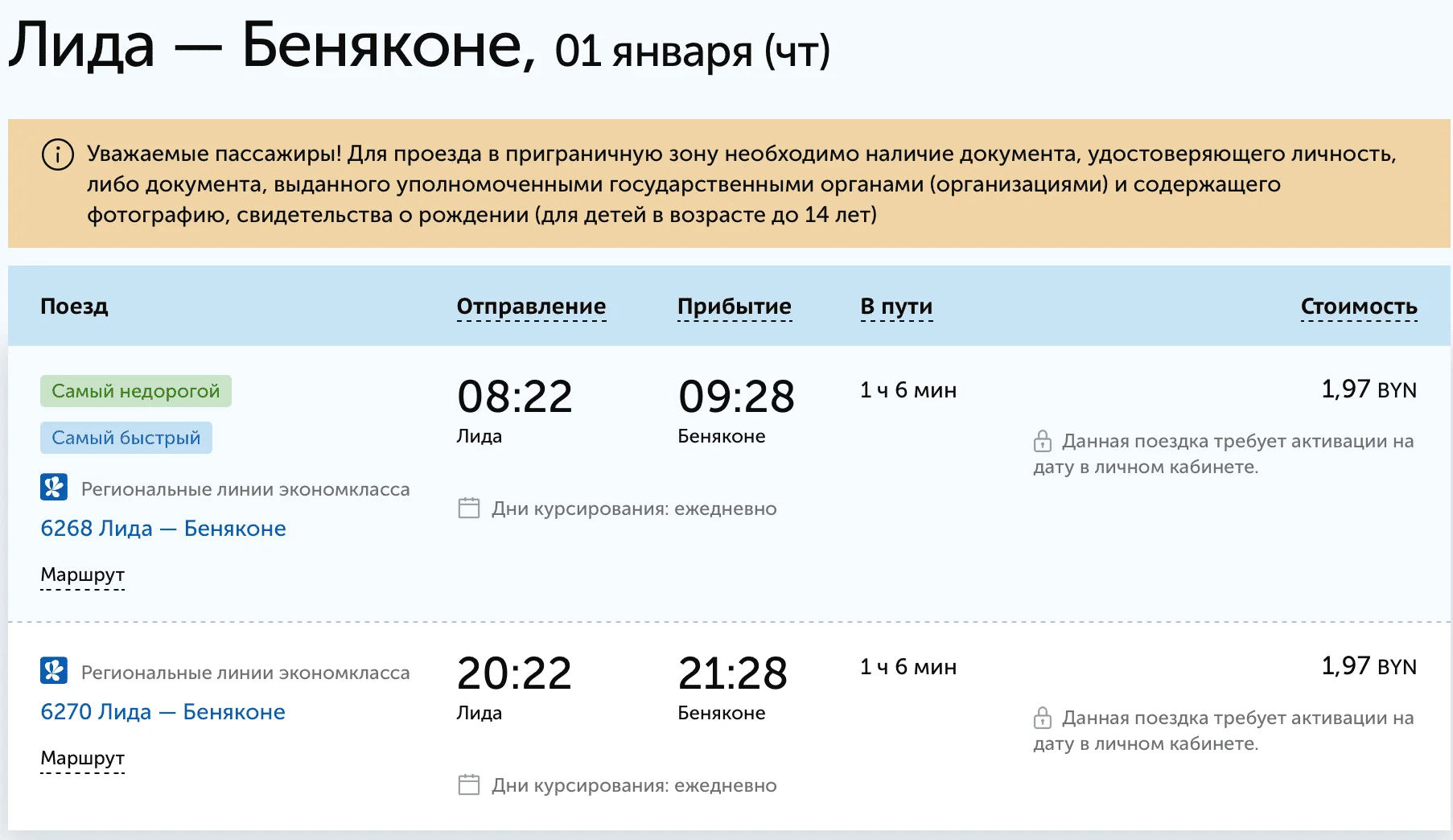 Правительство решило сохранить движение поезда в 2025 и 2026 годах. В расписании БелЖД уже есть график движения поезда на 1 января 2026. Из Лиды поезд выезжает в 08:22, в Беняконе пребывает к 09:28. Стоимость билета — 1,97 руб.