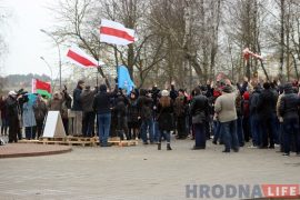 Несколько человек с флагами ОГП, БХД и бело-красно-белым флагом собрались в воскресенье 19 февраля в 14.00 на ступеньках дворца культуры текстильщиков. Они кричали «Жыве Беларусь»…